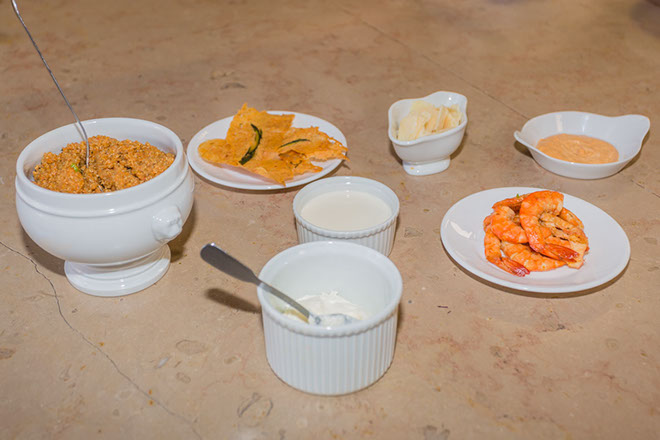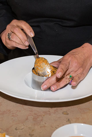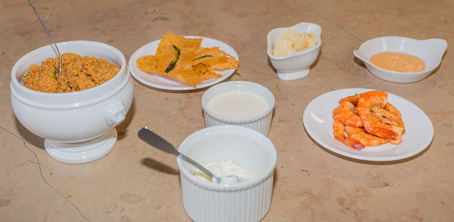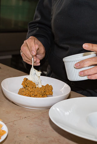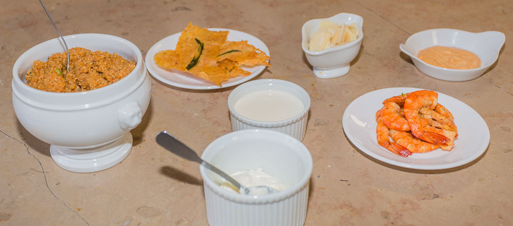 Assaisonnement du quinoa : Dans une casserole, faire revenir le reste d’oignons, 1 cuillère de piment « PANCA », les tomates, le reste d’ail finement haché avec un filet d’huile d’olive, jusqu’à ce que la préparation soit homogène. Ajouter le quinoa précuit, en ayant préalablement pris soin d’enlever le bouquet garni. Mélanger. Puis ajouter tout doucement le fumet de langoustine. Bien mélanger, laisser mijoter à feu très doux pendant 10 minutes. Pour finir, ajouter quelques langoustines, puis 10 cl. de crème fraiche liquide. Corriger si besoin l’assaisonnement en sel.