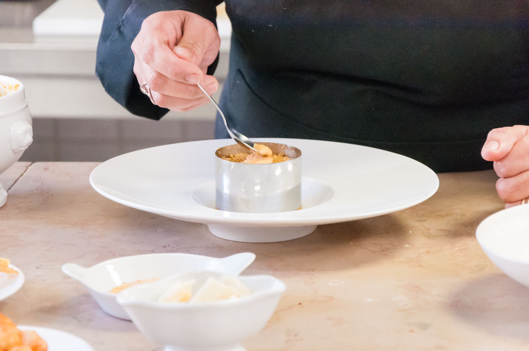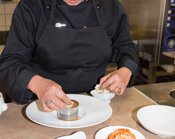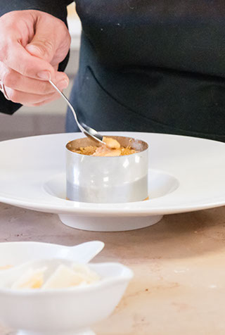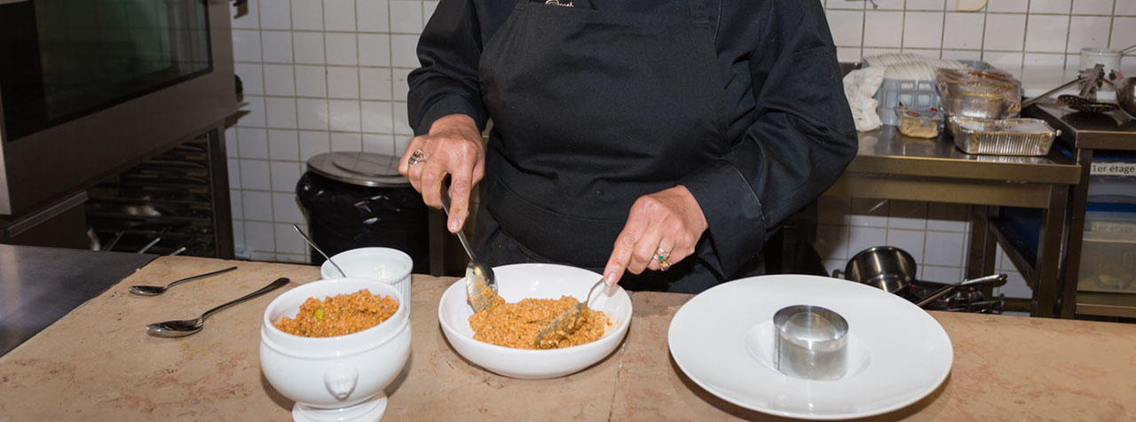 Dressage du plat : Dresser le quinoa sur l’assiette à l’aide d’un moule/emporte-pièce. Décorer avec quelques queues de langoustines et d’une tuile de pommes de terre et quinoa ou bien de ciboulette finement ciselée.