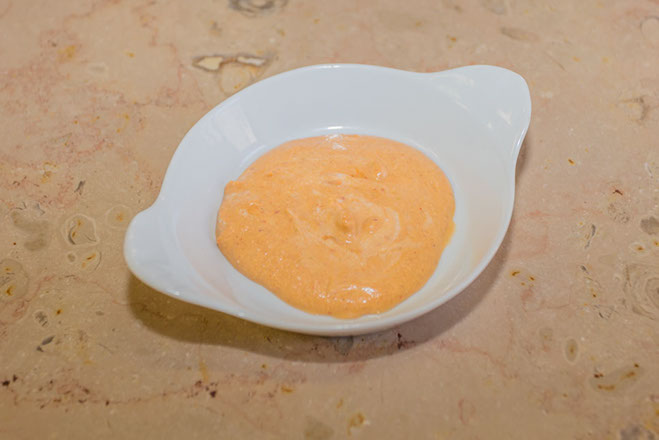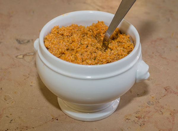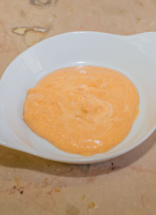 Elaboration du fumet de corail de Langoustines : Dans un blender, mélanger les carcasses (sans les queues) avec la sauce de cuisson des langoustines. Pour bien récupérer la sauce de cuisson, mouiller la casserole avec une tasse d’eau. Mixer le tout puis passer au chinois (à défaut une passoire). Récupérer le maximum de la préparation (cette opération est importante car c’est cette préparation qui donnera le goût au Quinoa). Réserver.