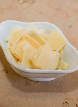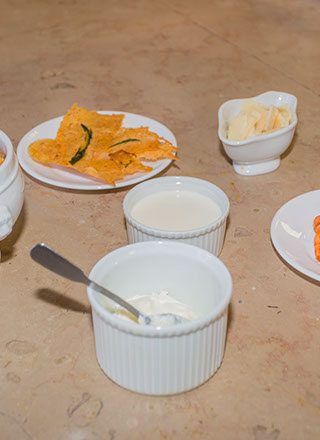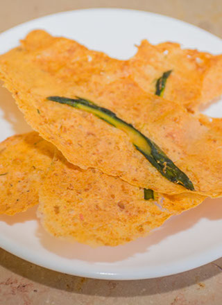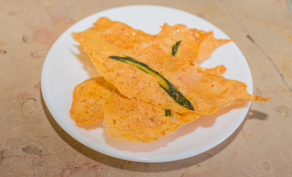 Elaboration des Tuiles de pomme de terre, éclat de Quinoa : Dans un blender, mettre une pomme de terre cuite avec un blanc d’œuf. Mixer. Assaisonner de sel et poivre. Dans un plat, déposer une feuille de papier cuisson préalablement graissée. Pour former une tuile, verser une cuillère à soupe de la préparation et l’étaler suivant la taille désirée. Répéter l’opération plusieurs fois. Saupoudrer de quelques graines de Quinoa cuites (réservées à l’étape 2) et de parmesan râpé. Préchauffer le four 10 minutes à 100°C, puis cuire les tuiles 40 minutes.